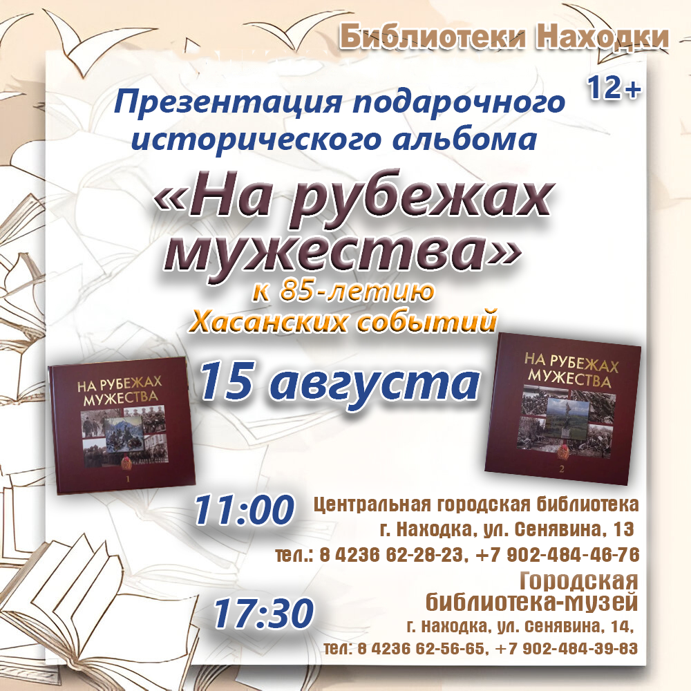 8 августа в Центральной городской библиотеке и Городской библиотеке-музее состоятся презентации подарочного исторического альбома в двух томах «На рубежах мужества», посвященного 85-летию Хасанских событий.