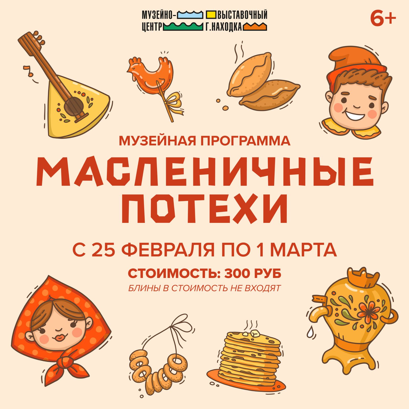 Старинный славянский праздник Масленицы спешит растопить зимние морозы! Музейно-выставочный центр г. Находка приглашает Вас на уютные и весёлые гуляния. Сестрицы – Зима и Весна – закружат гостей в карусели из лент, устроят соревнования в бросании валенок, битву мешками и много других интересных забав. А в конце праздника Вас ждут тёплые посиделки у самовара с чаем и вкусными блинами.