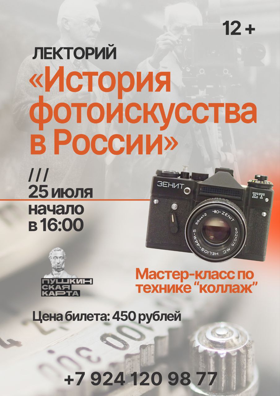 Появление фотографии в России в изящном XIX веке сразу вызвало необычайный интерес к технологии, чьё энергичное развитие быстро превратило её в настоящее искусство. В рамках выставки «Авангардный шаг» фотограф Данил Ласица расскажет о развитии фотографии в нашей стране, именитых мастерах разных эпох и о том, какой вклад они внесли в фотографический мир. А после лекции автор поделится секретами создания интересных и актуальных фотоколлажей на мастер-классе, по окончании которого Вы сможете забрать свои работы.